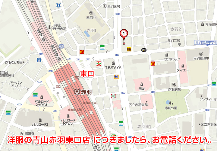 住所: 洋服の青山赤羽東口店 につきましたら、お電話ください。